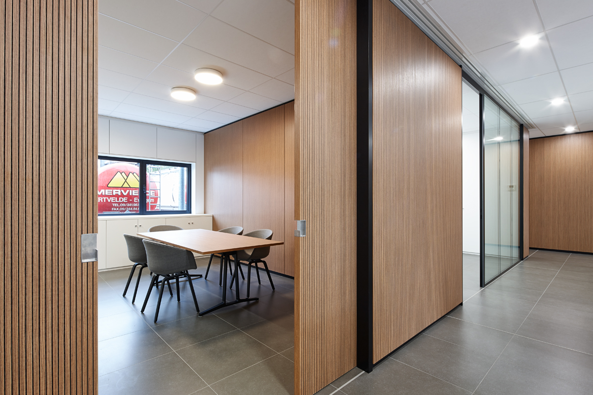Daarnaast produceren we ook akoestisch absorberende rechte ophangende schuifwanden op maat. Deze worden opgebouwd uit beide zijden een TYPE Db, Dr, Dw, M, N en in de kern een vol randkader met absorptie vulling in PRIMAWOOL. Dikte +/- 60 mm.